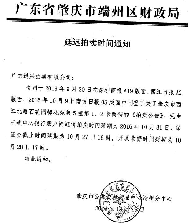 請于10月20日16時前將保證金匯入指定賬戶(戶名:肇慶市公共資源交易中心端州分中心;開戶行:中國農(nóng)業(yè)銀行肇慶市城區(qū)支行;賬號:44642401040009585,請注明“拍賣保證金”,以到帳為準(zhǔn),聯(lián)系電話:0758-2523918)。10月21日17時前到肇慶市端州區(qū)東湖二路尚東康城第2、3、4棟10號2樓開具收據(jù)(逾期不予辦理),并攜帶有效身份證明、保證金收據(jù)原件及復(fù)印件到拍賣會現(xiàn)場辦理競買手續(xù)。資料備索。展示時間:10月18-19日(請?zhí)崆邦A(yù)約)。聯(lián)系電話:0758-2736991、0755-25409740、13602972115任生。肇慶市公共資源交易中心端州分中心電話:0758-2523918。公司網(wǎng)址:www.aszaojiao.cn。