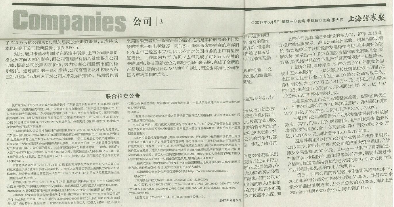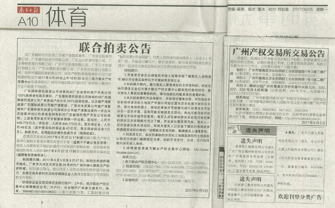 本公告刊登于2017年6月5日《上海證券報》3版、《南方日報》A10版,6月6日《廣州日報》18版