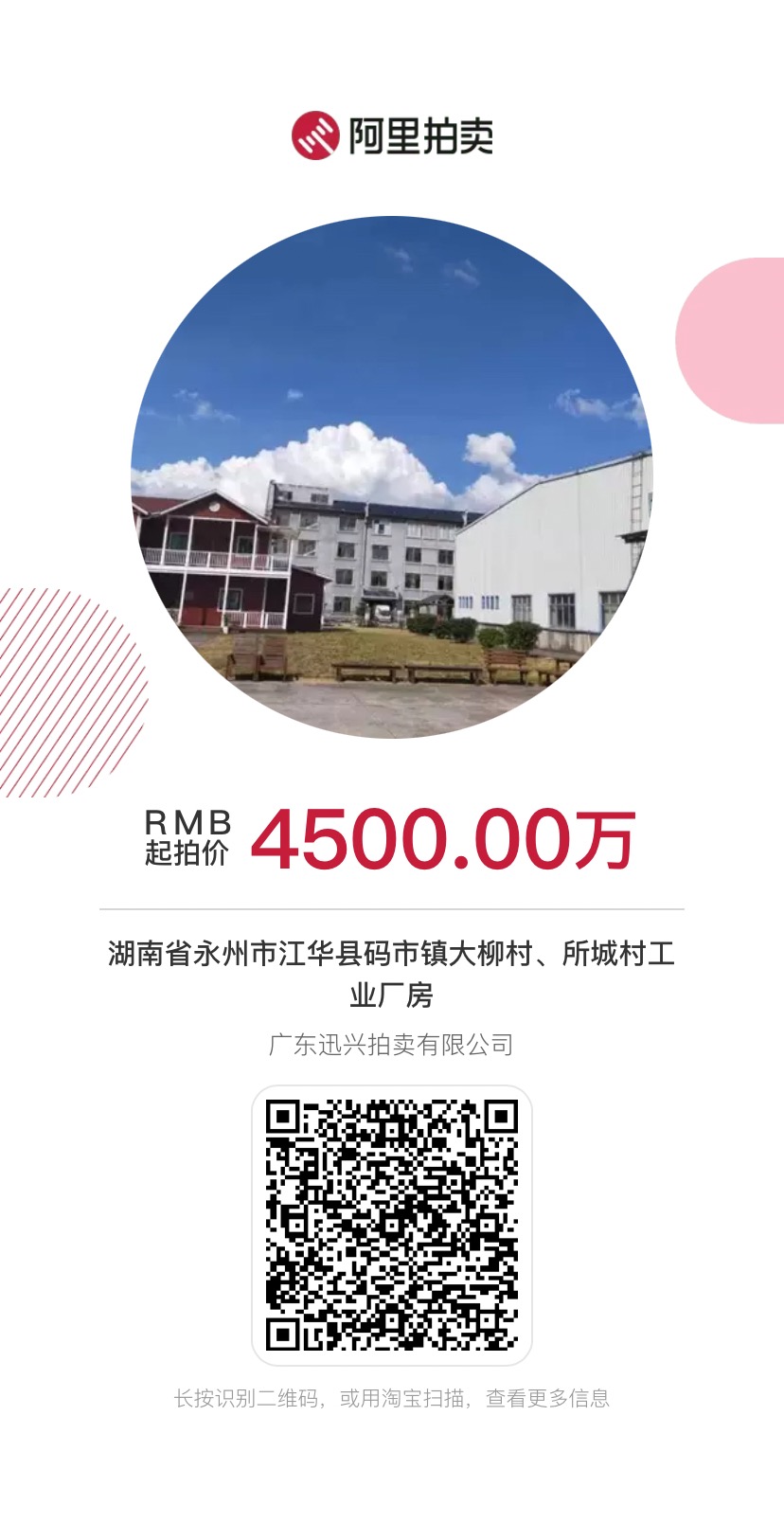 標(biāo)的物描述:湖南省永州市江華縣碼市鎮(zhèn)大柳村、所城村工業(yè)廠房,占地面積70691.85平方米,建筑面積有證10435平方米+未辦證3500平方米(實(shí)看現(xiàn)狀為準(zhǔn)) 平方米; 物業(yè)用途為:廠房 ;物業(yè)所有權(quán)證證號(hào)為:江國(guó)用(2014)第0088號(hào)、江國(guó)用(2014)第0112號(hào)、江華產(chǎn)權(quán)證碼市字第0140191號(hào)、江華產(chǎn)權(quán)證碼市字第0140192號(hào)、 江華產(chǎn)權(quán)證碼市字第0150034號(hào) ;共二本土地證、三本房產(chǎn)證,起拍價(jià):4500萬(wàn)(目前公司自用,拍賣成交過(guò)戶完畢后,即可移交);此物業(yè)地處粵湘桂三省交界處重鎮(zhèn)碼市鎮(zhèn),離粵北重鎮(zhèn)連州市40公里,離廣州200多公里,隨著二廣高速及廣清永高鐵、連州機(jī)場(chǎng)的規(guī)劃建設(shè),連州將成為粵北地區(qū)的交通中心;園區(qū)綠化率高,環(huán)境優(yōu)美,交通便利,可享受政府優(yōu)惠政策;出租、自用投資均可;廠房共六棟,鋼架結(jié)構(gòu),層高9米。