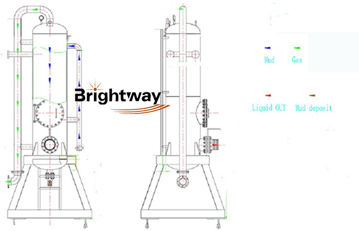 安裝就位后,將2號(hào)排氣管線引至距離井口60-80m處(管線自己配。如需廠家供給,訂貨時(shí)說明)。其3號(hào)進(jìn)漿口與旋轉(zhuǎn)防噴器或節(jié)流管匯連接,關(guān)閉4號(hào)排污口蝶閥,打開7號(hào)出漿口蝶閥,用管線接到1號(hào)泥漿罐內(nèi)即可。