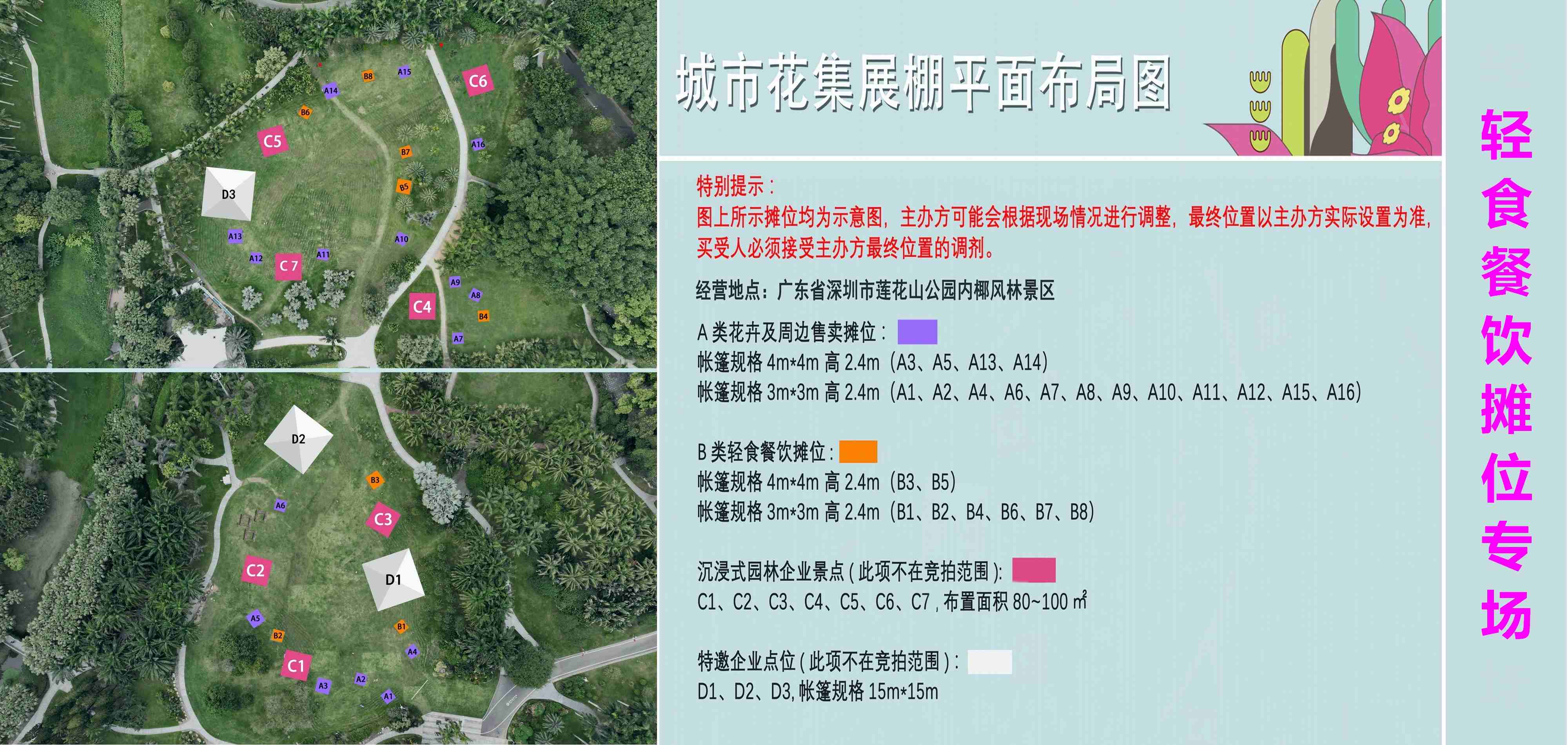 經(jīng)營(yíng)范圍:花卉、園藝及相關(guān)周邊的經(jīng)營(yíng)銷售,經(jīng)營(yíng)范圍包括鮮切花、小型觀賞植物、多肉植物、干花、花種,肥料及園藝用品、立體綠化系統(tǒng)、無(wú)土栽培、手工藝品(含植物標(biāo)本)及文創(chuàng)產(chǎn)品等類別,每位競(jìng)買人最多能競(jìng)投2個(gè)攤位;