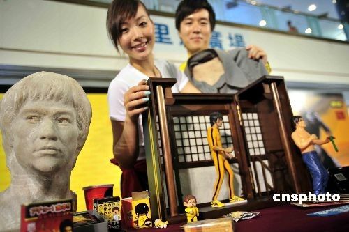 資料圖:2009年7月8日,定于7月15日開展的“李小龍珍藏展”記者會,在香港荷里活廣場舉行。該展覽展出超過三百件由李小龍初出道至今的收藏品,包括李小龍?jiān)褂眠^之衣飾、日用品及練武用品、首次曝光相片、全球唯一及李小龍最早時期劇照、海報(bào)及電影道具等,見證一代巨星的傳奇一生。