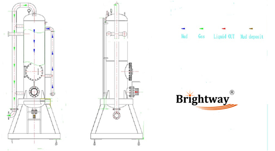 BWZYQ系列液氣分離器是在石油鉆井中處理鉆井泥漿氣浸的專用設備。氣浸鉆井泥漿從分離器進液口切線進入分離器內(nèi),順著罐體內(nèi)壁落在專業(yè)設計好的內(nèi)擋板上,發(fā)生對此碰撞,從而增大暴露表面積,向下流動,造成紊流狀態(tài),使鉆井泥漿里含有的氣體和液體分離開來。游離在罐內(nèi)的氣體通過灌頂?shù)臍怏w出口排出,排氣管長度由現(xiàn)場確定及配套,并引到安全處,而脫氣后的鉆井液排入循環(huán)罐。